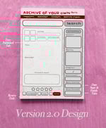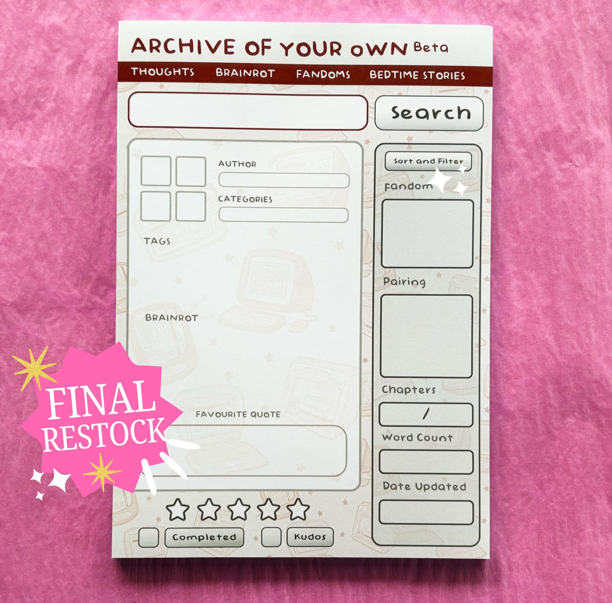 The Archive of Your Own (Beta) Notepad uses premium 100gsm paper with 50 tear-off sheets, perfect for scrapbooking and all your fic needs.
