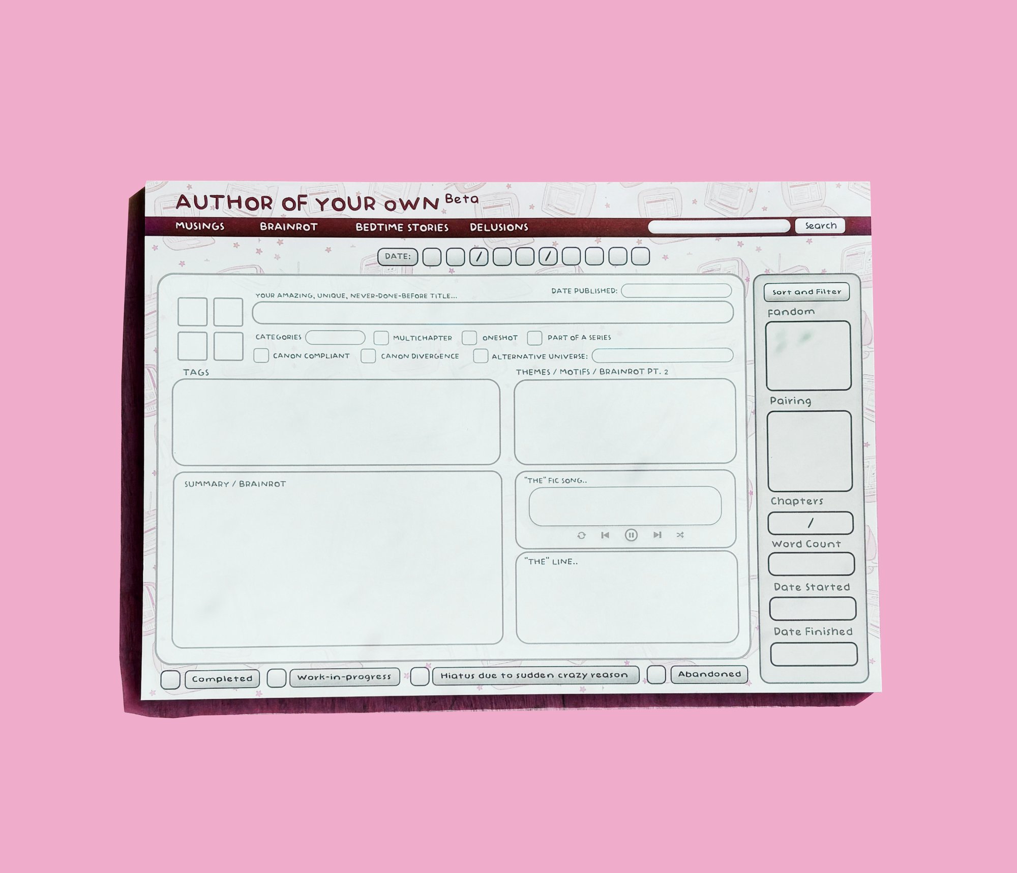 Welcome to the The Author of Your Own (Beta) A4 Notepad. Fun for both authors and readers for the silliest fic 'logs', it uses our premium 100gsm A4 paper with 50 non-sticky sheets—perfect for scrapbooking. Proudly designed, printed and made in Australia, this notepad is a part of the 'Eien' collection, a project by illustraice designed under the consultation of a dozen fanfiction authors.